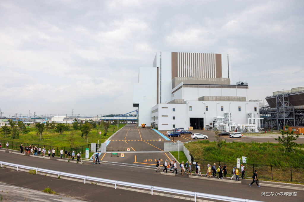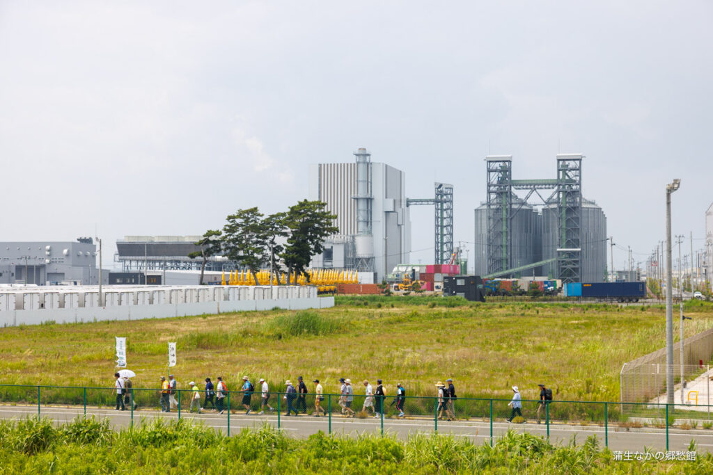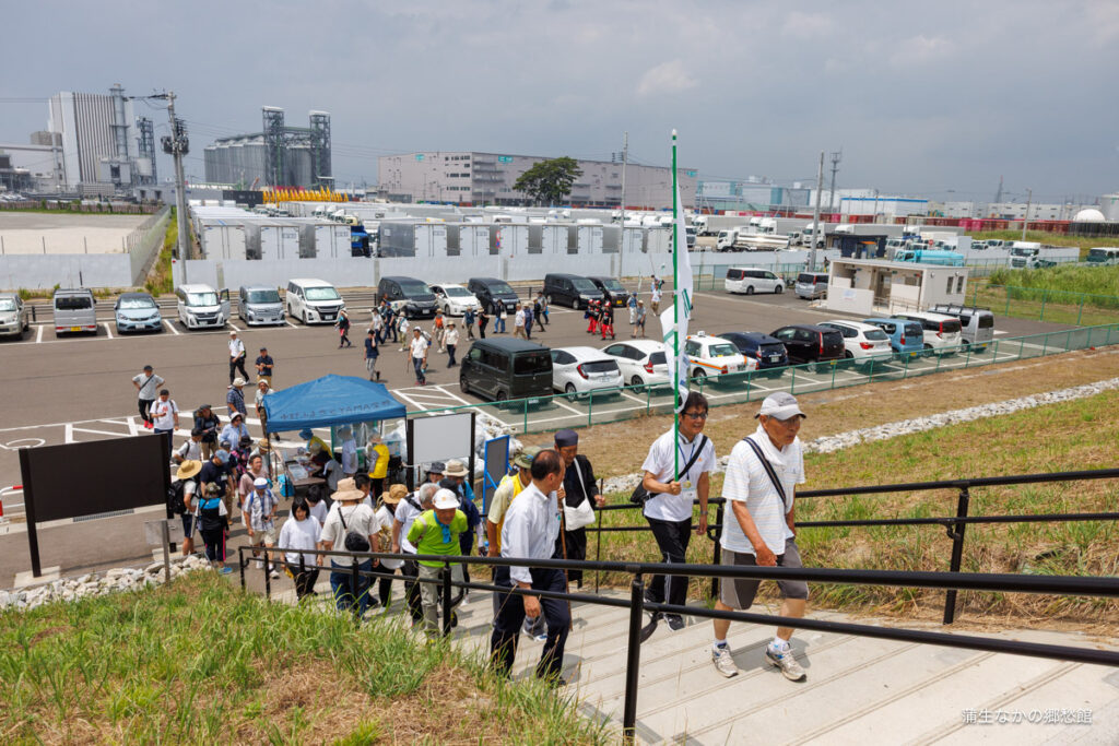 7/06は、日本一低い山・日和山の山開き。登山客ご一行様が、なかの伝承の丘を出発して、郷愁館のある杜の都バイオマス発電所の前を歩いて行きます。