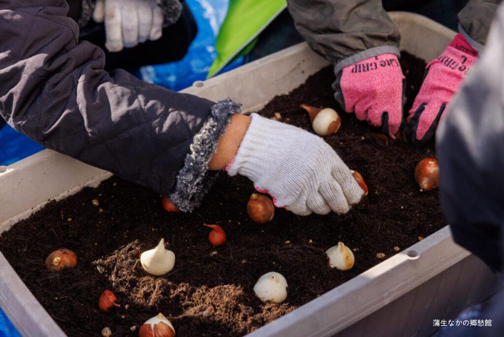 花壇整備は毎月少しずつやってきているんですが、今回は一般の方も参加しやすい日として開催。初めていらっしゃった方々も一緒になって、チューリップの球根をプランターに植えていきます。