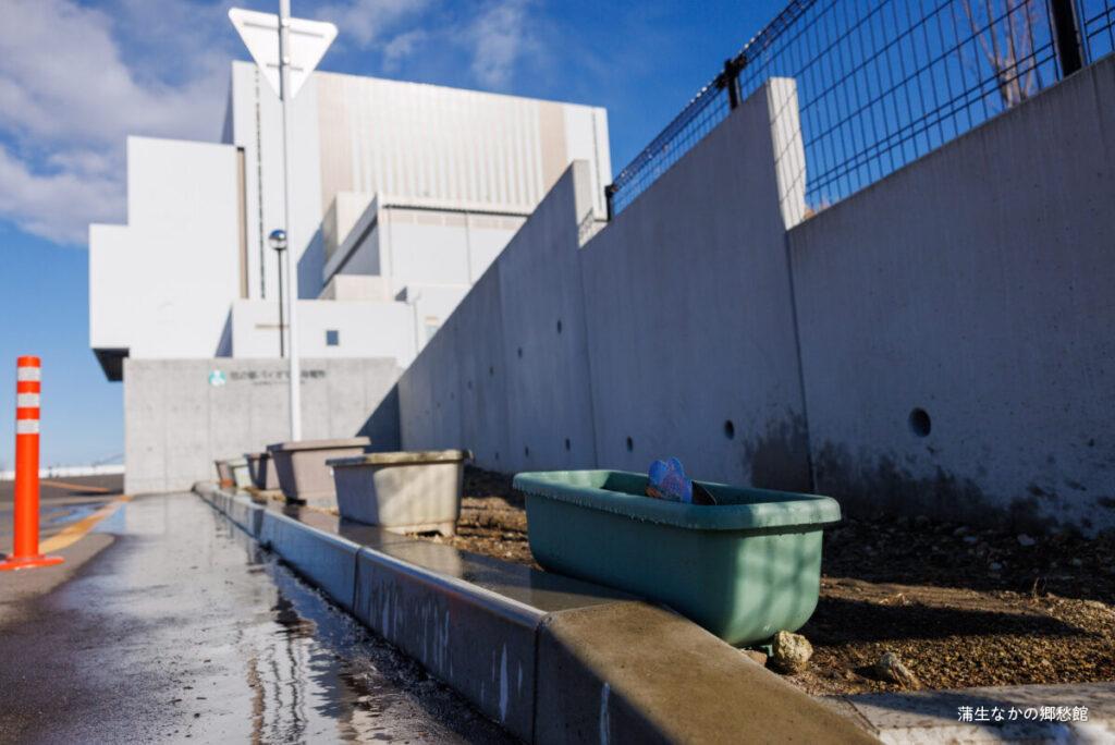 植え終わったプランターを発電所の正門のところへ設置して、本日の作業は終了です。