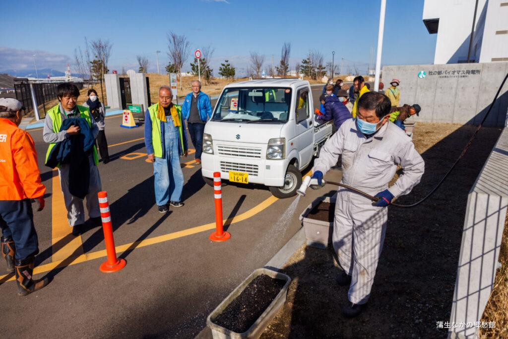 植え終わったプランターを発電所の正門のところへ設置して、本日の作業は終了です。