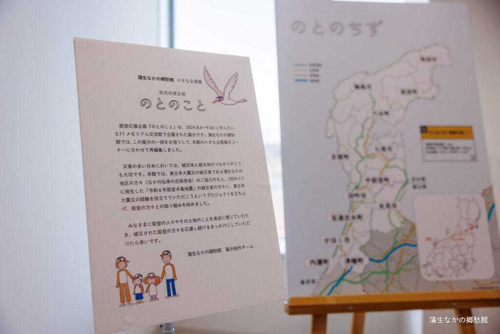せんだい3.11メモリアル交流館で開催されていた展示を郷愁館用にコンパクトに再編集したものですが、震災のあった能登ってこんな土地なんだな、と興味をもってもらえれば幸いです。