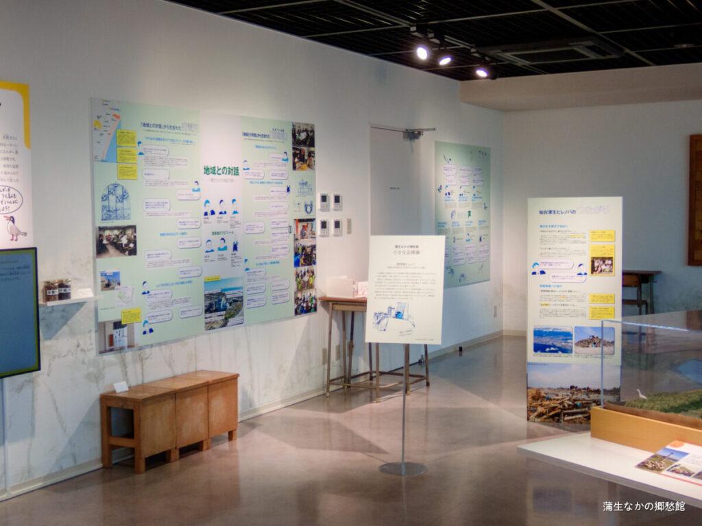 東日本大震災によって集団移転跡地となった蒲生の地に作られた「杜の都バイオマス発電所」そして「蒲生なかの郷愁館」は、地域の方々との様々な話し合いを通して形作られてきました。誰がどんなやりとりをして、どんなことを考えて今に至ったのかを、関係者の言葉を通して知ることができる展示です。